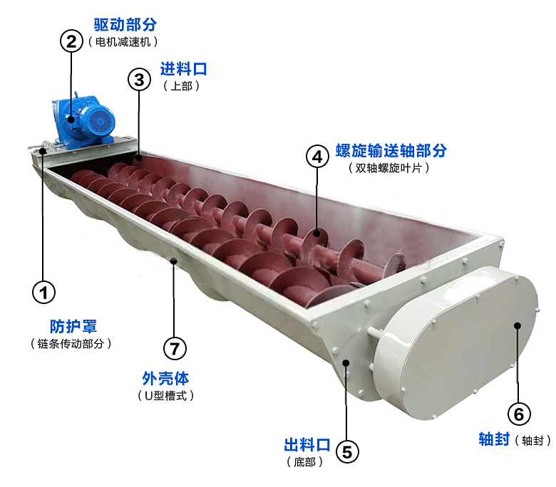 物料從進料口加入,當轉軸轉動時,物料受到螺旋葉片反向推力的作用。該推力的徑向分力和葉片對物料的摩擦力,有可能帶著物料繞軸轉動,但由于物料本身的重力和料槽對物料的摩擦力的緣故,才不與螺旋葉片一起旋轉,而在葉片反向推力的軸向分力作用下,沿著料槽軸向移動。